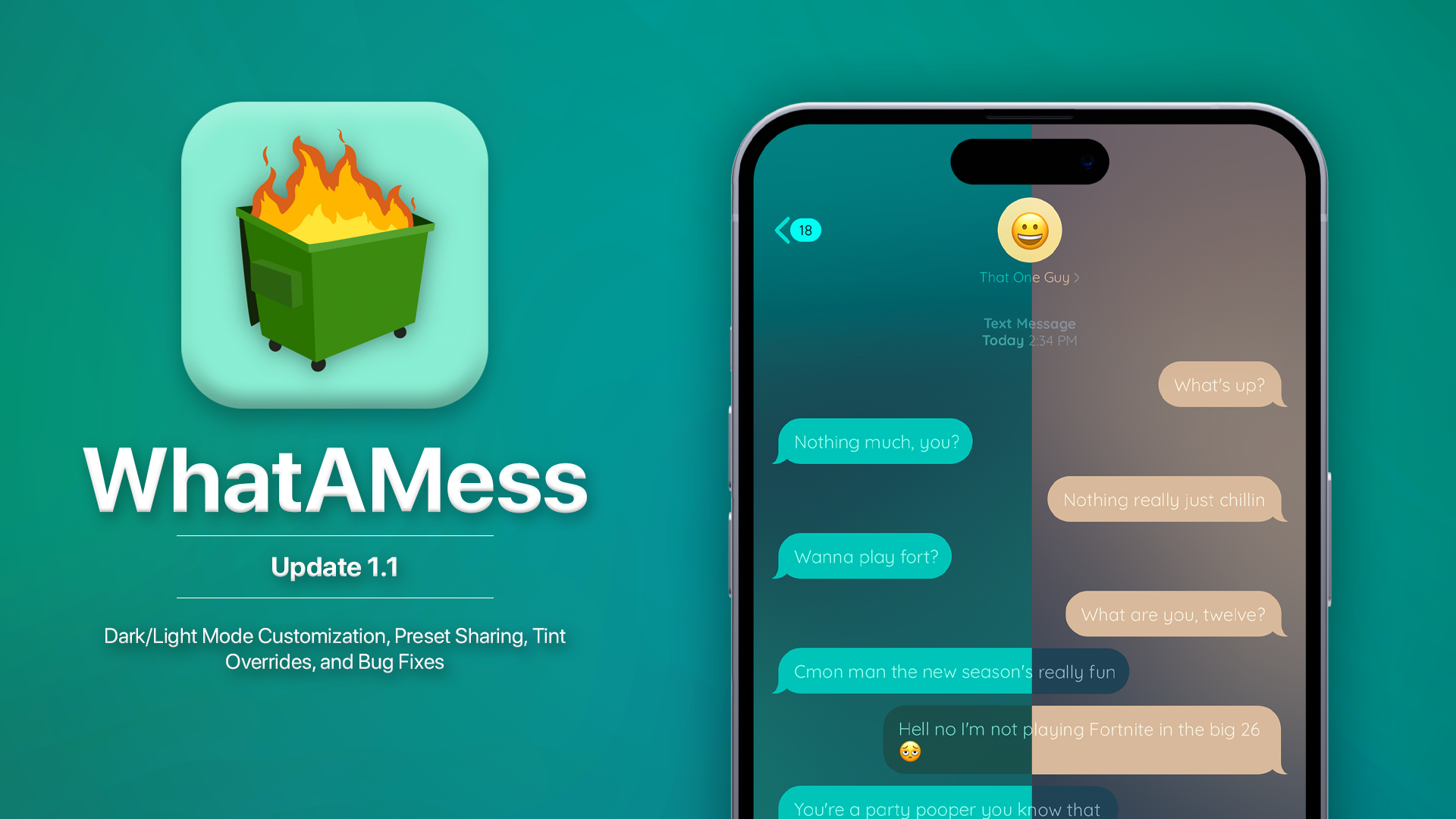 For far too long has the Messages app on modern jailbreaks been boring! With WhatAMess, customize (nearly) every color possible across the Messages app. Tailor your app to match your device theme, set your background to what you value most, or just get rid of those green bubbles.